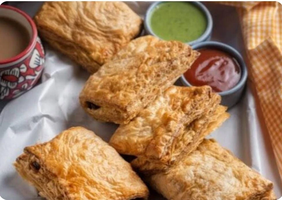A flaky paneer puff with a crispy golden crust and a mildly spiced paneer filling, offering a light yet flavorful snack.