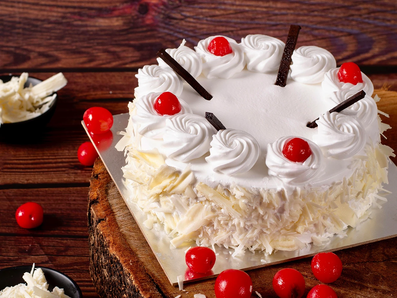 A mouth-watering delight with layers of soft vanilla sponge fresh cream wtih cherry crush .