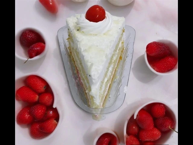 A mouth-watering delight with layers of soft vanilla sponge fresh cream wtih cherry crush .