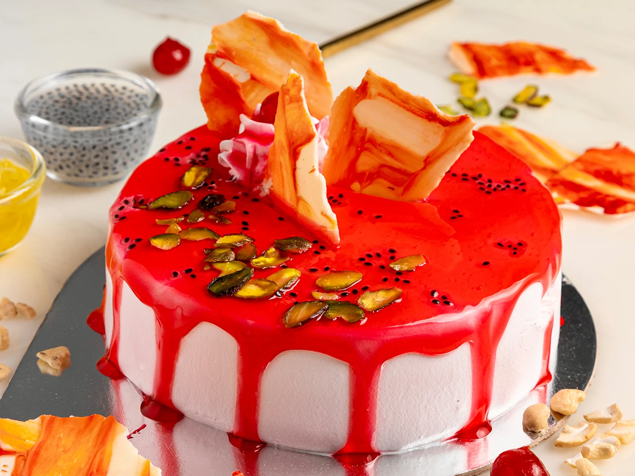 A vibrant falooda cake infused with rose flavor, layered with vermicelli, bringing the classic dessert to life in every bite.